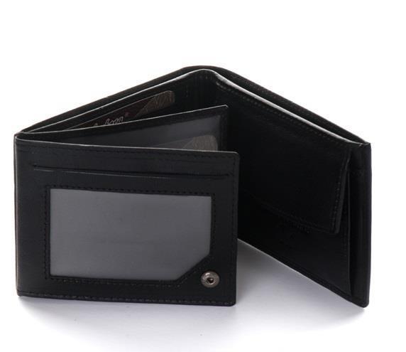 Carteira de pele preta com mola interior, com espaço para até 14 cartões e notas.