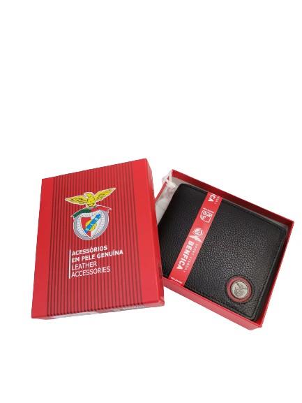 Carteira C/ Porta Moedas preta e Logo Metal Em Pele – SLB, artigo original com selo a certificar o produto oficial do Sport Lisboa e Benfica. O material é pele e tem diversos compartimentos, tornando este artigo não só único mas também prático!
