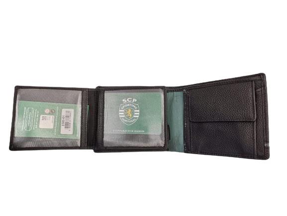 Carteira Preta Grande em Pele com Linha Verde e Presilha no Interior – SCP, artigo original com selo a certificar o produto oficial do Sporting Clube de Portugal. O material em pele, bem como o espaço para moedas tornam esta carteira preta com linha verde única.