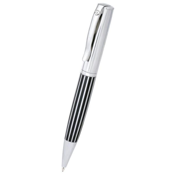 Esferográfica prateada com riscas pretas, estilo clássico, com caixa — perfeita para presente.