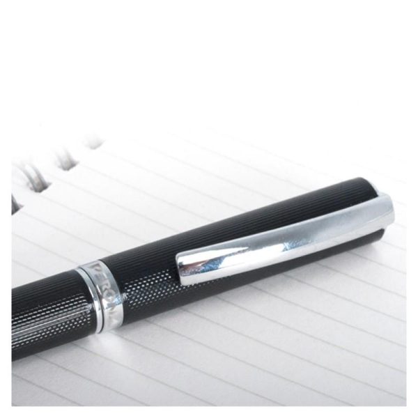 Esferográfica preta com relevo de pontos, elegante e prática; vem com caixa para presente.