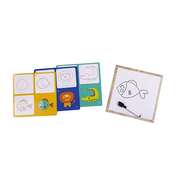 Contém 24 cartões, um marcador com um apagador incorporado e um quadro branco com material apagável.