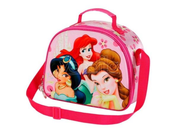 Lancheira escolar 3D em rosa com relevo de princesas, prática e resistente.