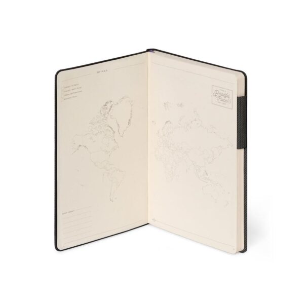 Organize-se com estilo num bloco de notas A5 com elástico cinzento: páginas pautadas, índice e mapas.
