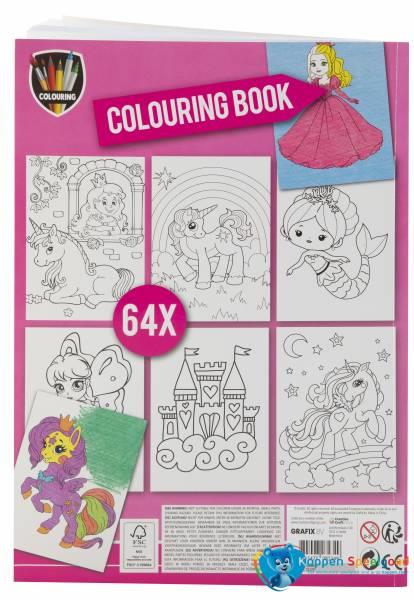 Livro de colorir em formato A4, 24 páginas, em rosa, com princesas e unicórnios, perfeito para horas criativas.