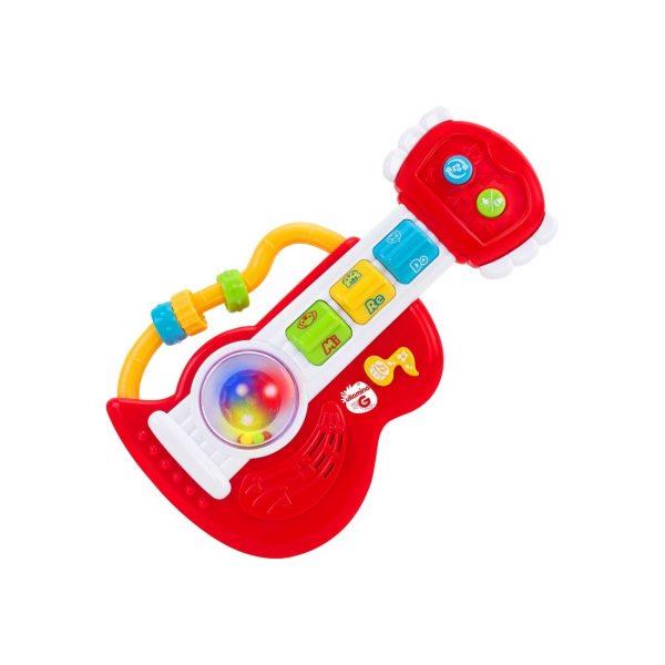 Guitarra de brinquedo com música e luzes coloridas para estimular os sentidos.