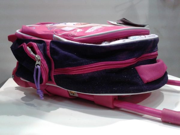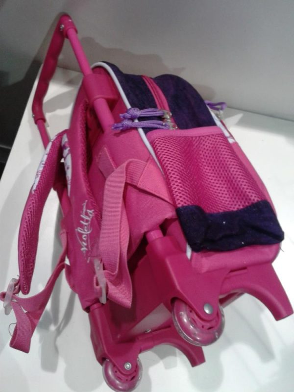 Mochila Violetta com Trolley Pré-Escolar da Disney com bastante espaço para todo o material escolar e além disso com duas bolsas laterais e alças almofadadas.