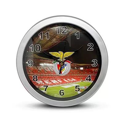 Relógio de parede com o estádio do SL Benfica ao fundo, ideal para fãs que gostam de decorar com o espírito do clube.