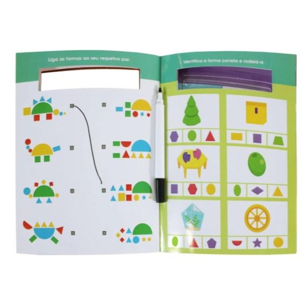 Livro de atividades para explorar formas e estimular o raciocínio lógico.