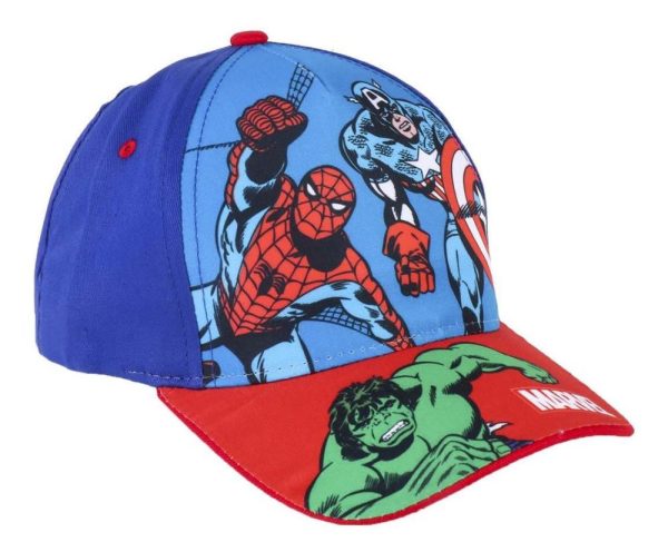 Boné azul com pala vermelha, inspirado nos Avengers, para um visual descontraído e colorido.