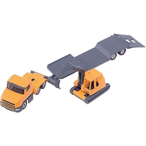 Camião de transporte em escala 1:64 com escavadora, detalhes realistas em metal e plástico.