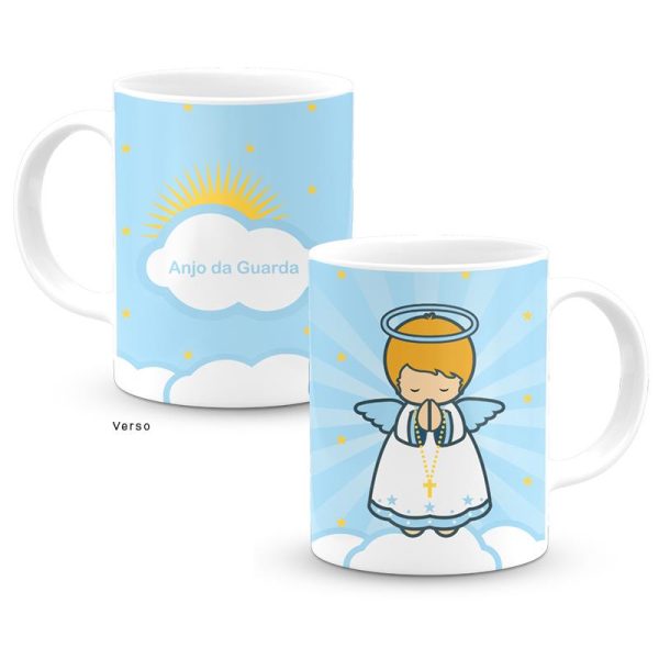 Caneca decorativa em cerâmica com Anjo da Guarda azul, ideal para presentear em ocasiões especiais.