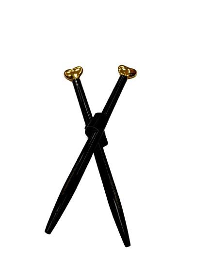 Caneta preta com detalhe de coração dourado, para escrever com estilo.