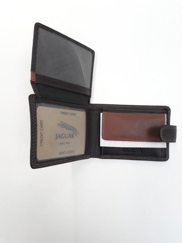 Carteira Pequena com Mola, Aba e Costura Clara Pele Vaca Boston Castanha – Jaguar , com porta-moedas e vários compartimentos para cartões.