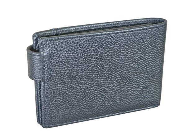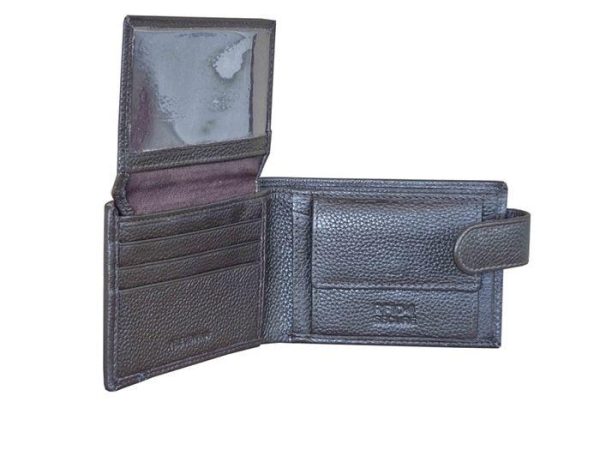 Carteira compacta em pele castanha com presilha, prática e bem organizada para documentos e cartões.