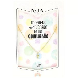 Colar elegante em aço prateado com detalhes florais, acompanhado de envelope e mensagem original — o presente ideal para a Comunhão.