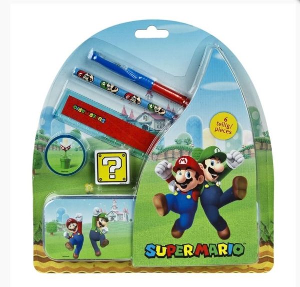 Set de escrita temático Super Mario com seis peças úteis.