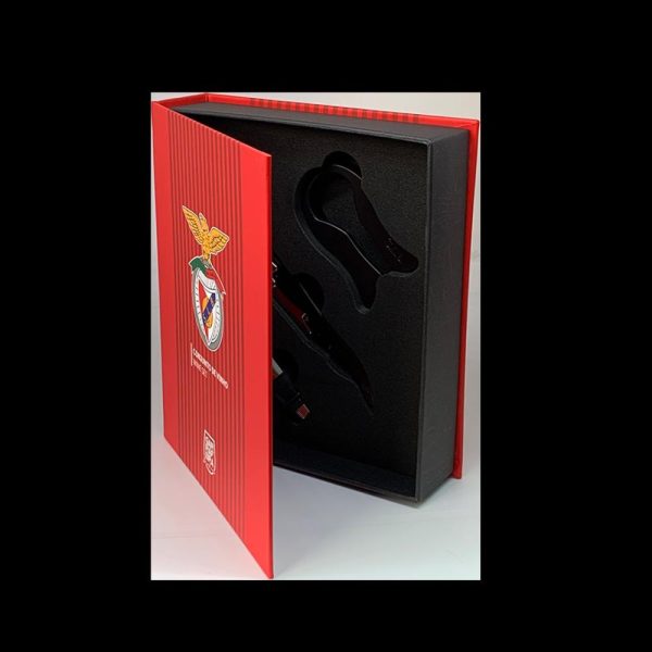 Vinho em formato de livro com design sofisticado, ideal para fãs do Benfica.