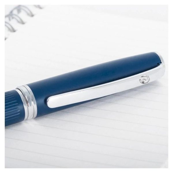 Esferográfica azul escura com relevo de riscas — conjunto de presente Perona com estojo acolchoado, acabamento em metal e plástico mate, clipe cromado e tinta preta.
