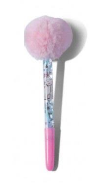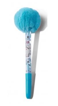 Esferográfica com motivo unicórnio, pompom macio e purpurina flutuante em cores variadas.