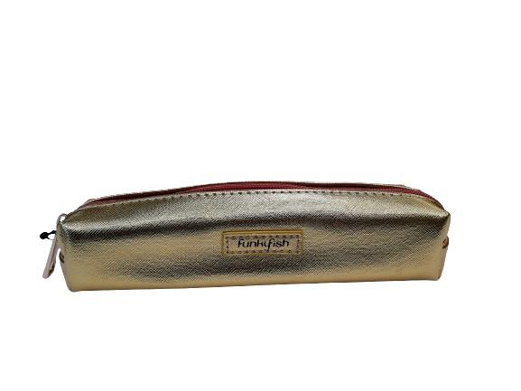 Estojo redondo dourado com fecho em rosa salmão e logótipo Funky Fish na frente.