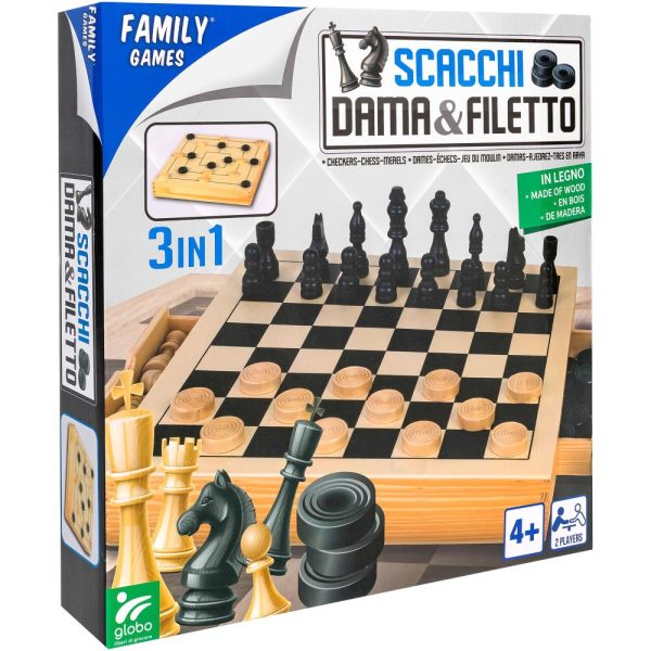 Jogo 3 em 1 Jogo Clássico em Madeira – Family Games – Globo, conjunto clássico, divertido e as suas peças são feitas em madeira.