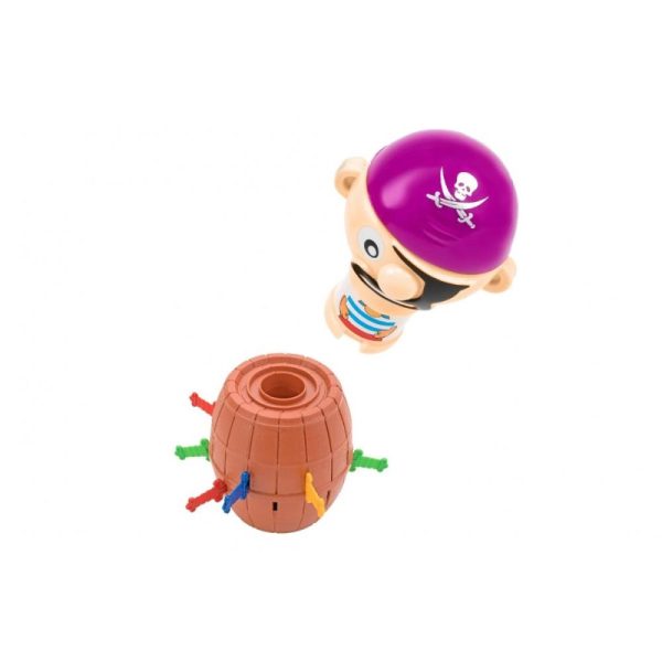 Divertido jogo de destreza com pirata, barril giratório e espadas — diversão em família.