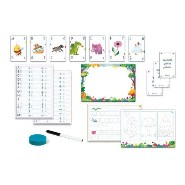 Jogos Educativos – Jogos de Escrita – Clementoni, contém 10 quadros para escrever e apagar, um marcador e uma esponja. A criança pode escolher entre muitas atividades divertidas e 20 exercícios para aprender a pré-escrita, letra de imprensa, letra cursiva e muitas palavras.