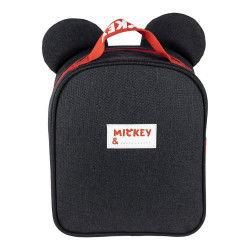 Lancheira escolar 3D preta e vermelha com orelhas e pega de mão, estilo Mickey, prática e divertida.