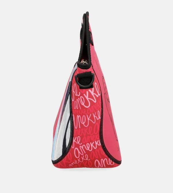 Lancheira de neopreno rosa com design original da Anekke; cada face é única, prática para transportar refeições com estilo.