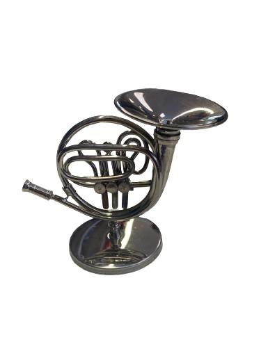 Trompa em escala 1:6, 9,6 cm, com acabamento prateado detalhado e base de apoio.