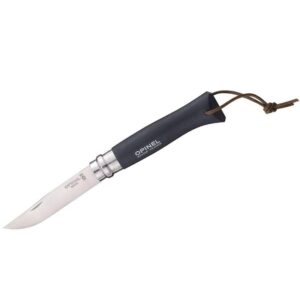 Navalha multifuncional Opinel nº9 com cabo azul em madeira, cordão de cabedal e lâmina de 8 cm — ferramenta versátil com várias funções num design clássico.