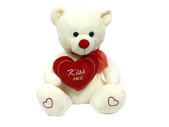 Peluche Urso Branco c/ Laço e Coração 35cm “Kiss Me”, peluche ideal para oferta no Dia dos Namorados ou noutra ocasião romântica e além disso muito fofinho ao toque.