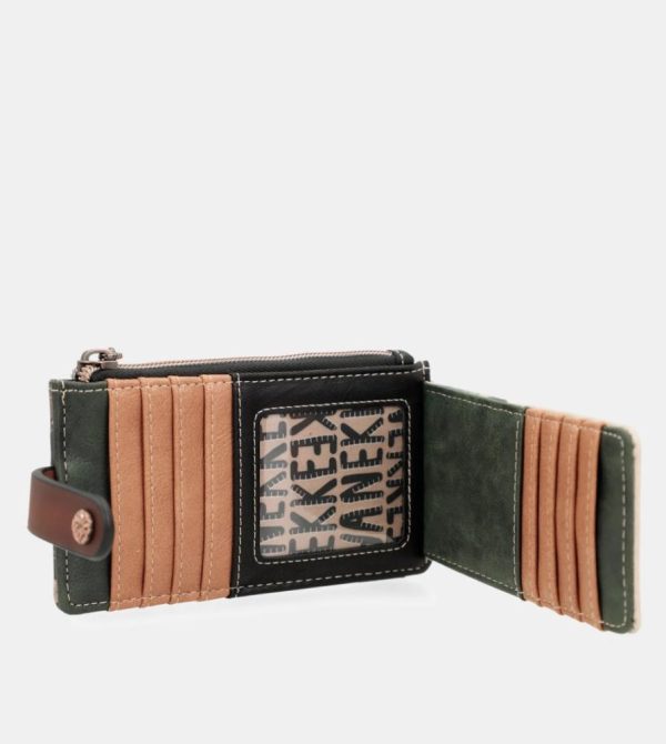 Porta-cartões comprido com vários compartimentos, proteção RFID e design floresta em tons naturais.