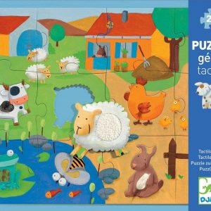 Puzzle táctil com 16 peças de animais, explorando texturas para estimular a concentração e a observação.