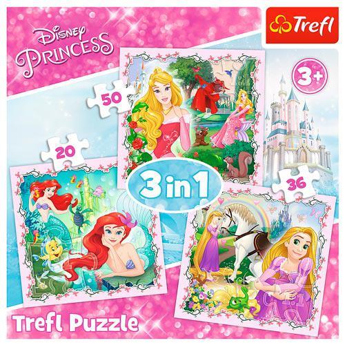 Puzzle 3 em 1 das Princesas Disney: 20, 36 e 50 peças para estimular o raciocínio lógico.