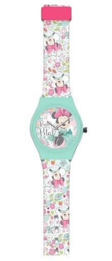 Relógio analógico verde menta com embalagem temática da Minnie, perfeito para fãs de Disney.