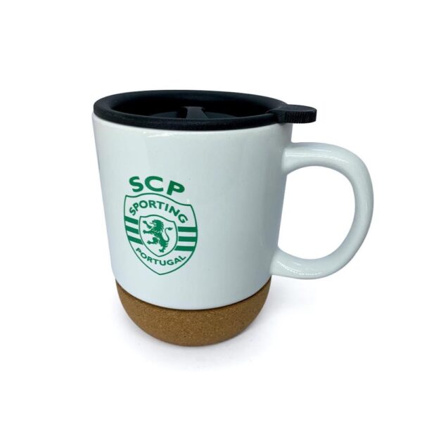 É um conjunto oficial do Sporting Clube de Portugal que inclui uma caneca branca com o escudo do clube e um porta-chaves metálico com bola decorativa, ideal para oferecer a adeptos leoninos.