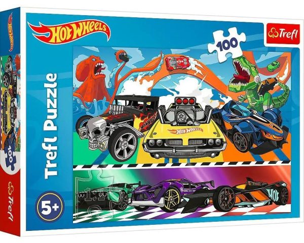 Puzzle de 100 peças com o tema Hot Wheels, para momentos de diversão.