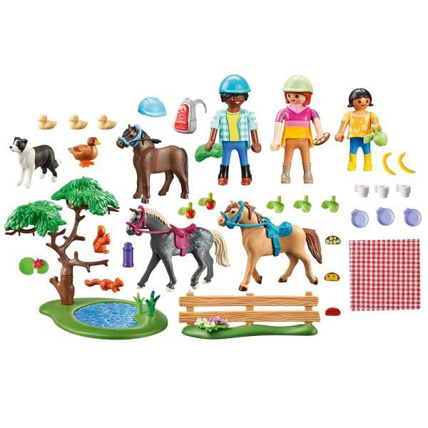 Aventura Picnic com Cavalos – Country – Playmobil, o conjunto contém uma figura de mulher adulta, homem e menina, dois cavalos e um potro, uma cerca, lagoa, árvore com galhos e vegetação, dois esquilos, um pato e três patinhos, um cão preto e branco, quatro maçãs verdes e duas maçãs vermelhas, um nenúfar com flor, uma toalha de mesa, três pratos, três xícaras, duas bananas, mochila, alfafa, uma garrafa térmica, um cacho com quatro flores, três bonés equestres (dois para adultos e um para crianças), duas selas, três mordidas, três rédeas e quatro sanduíches.