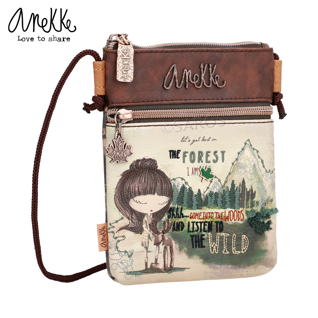 Bolsa Tiracolo Plana com Alça em Fio Floresta "Canada" - Anekke, a frente combina uma estampa inspirada nas florestas do Canadá com bordados e apliques decorativos, onde vemos Anekke alimentando um lindo alce em uma floresta. Sobre uma base de cor clara a estampa ganha vida, combinando diferentes tons de verde com detalhes bordados, e um suave prateado salpicando o céu que simula a neve. A parte traseira apresenta uma estampa estilo lenhador, inspirada em um negativo fotográfico em que várias silhuetas de animais e folhas são escondidas junto com frases inspiradoras. Pare e dê uma olhada, e encontre todos eles! O interior é forrado com um tecido original estampado com motivos da coleção e possui bolsos.