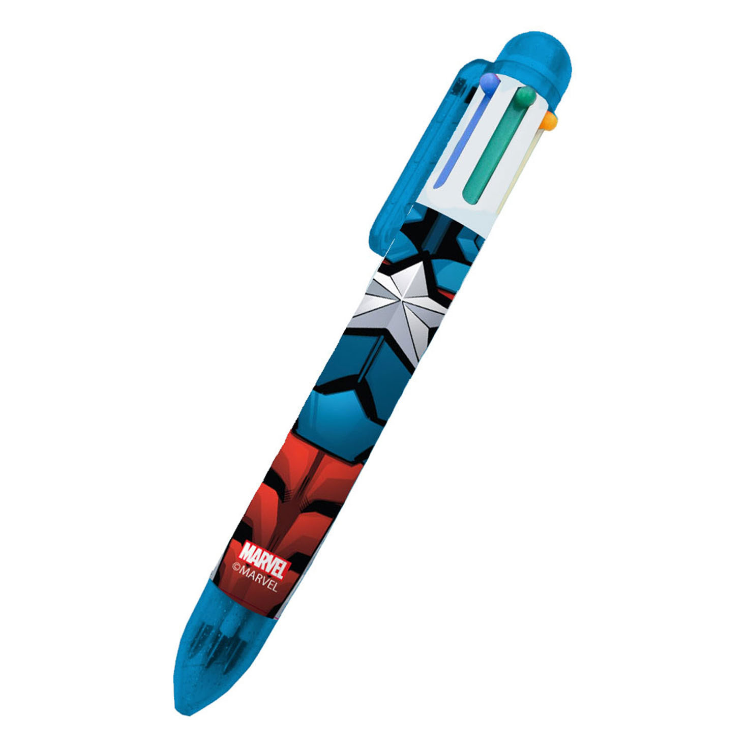 Caneta Multicolor Azul Fato Capitão America - Avengers, super útil por ter múltiplas cores na mesma caneta. Inclui o desenho em azul com o desenho do Capitão America.