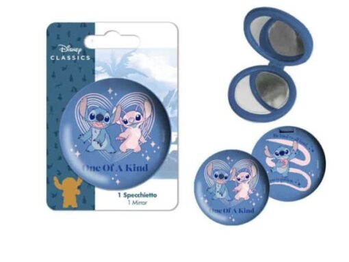 O espelho em blister "One Of A Kind" Stitch & Angel da Lilo & Stitch é prático e encantador. Com design temático dos personagens, é ideal para levar na mala ou usar no dia-a-dia. Perfeito para fãs que procuram funcionalidade com um toque divertido.
