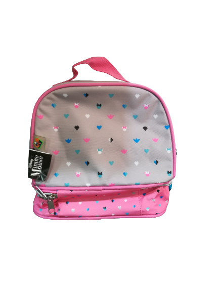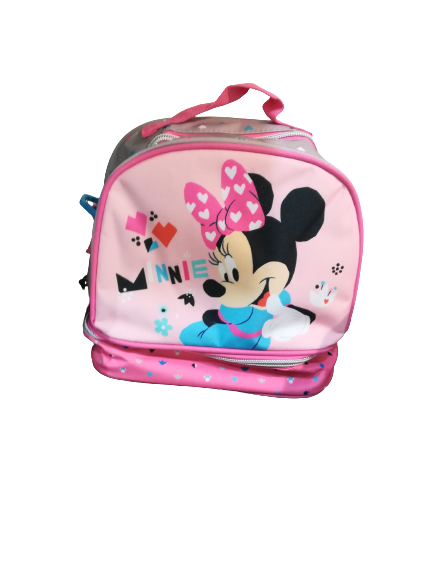 Lancheira/Mochila Têrmica - Minnie, com desenho super original e além do fecho de cima, tem fecho com compartimento em baixo.