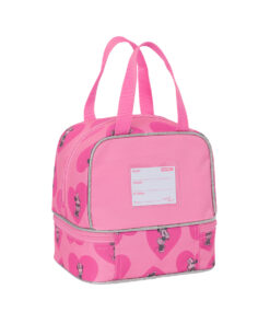 Com um compartimento principal e outro na base de porta-lanche. Alça dupla. Deslizante duplo no compartimento inferior para facilitar a sua abertura. Tem um cartão de identificação pessoal.