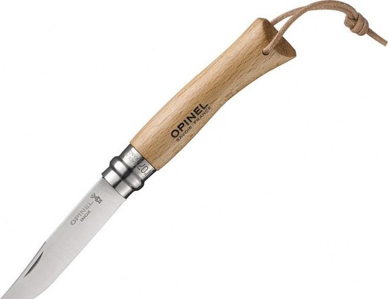 Navalha Opinel Inox nº7 c/ Cordão cor creme 8cm com cabo de madeira e além disso de estilo tradicional.