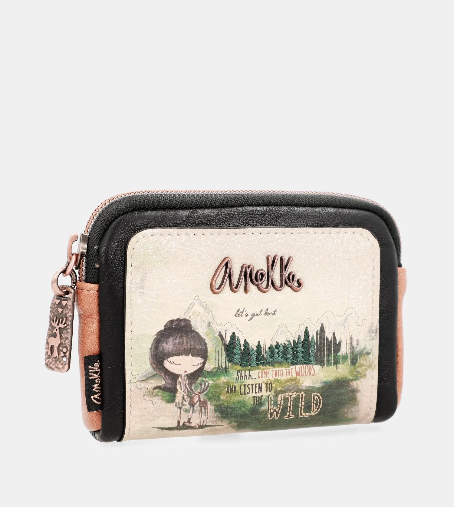 Porta-Moedas Com Fecho Floresta "Canada" - Anekke, a frente combina uma estampa inspirada nas florestas do Canadá com bordados e apliques decorativos, onde vemos Anekke alimentando um lindo alce em uma floresta.